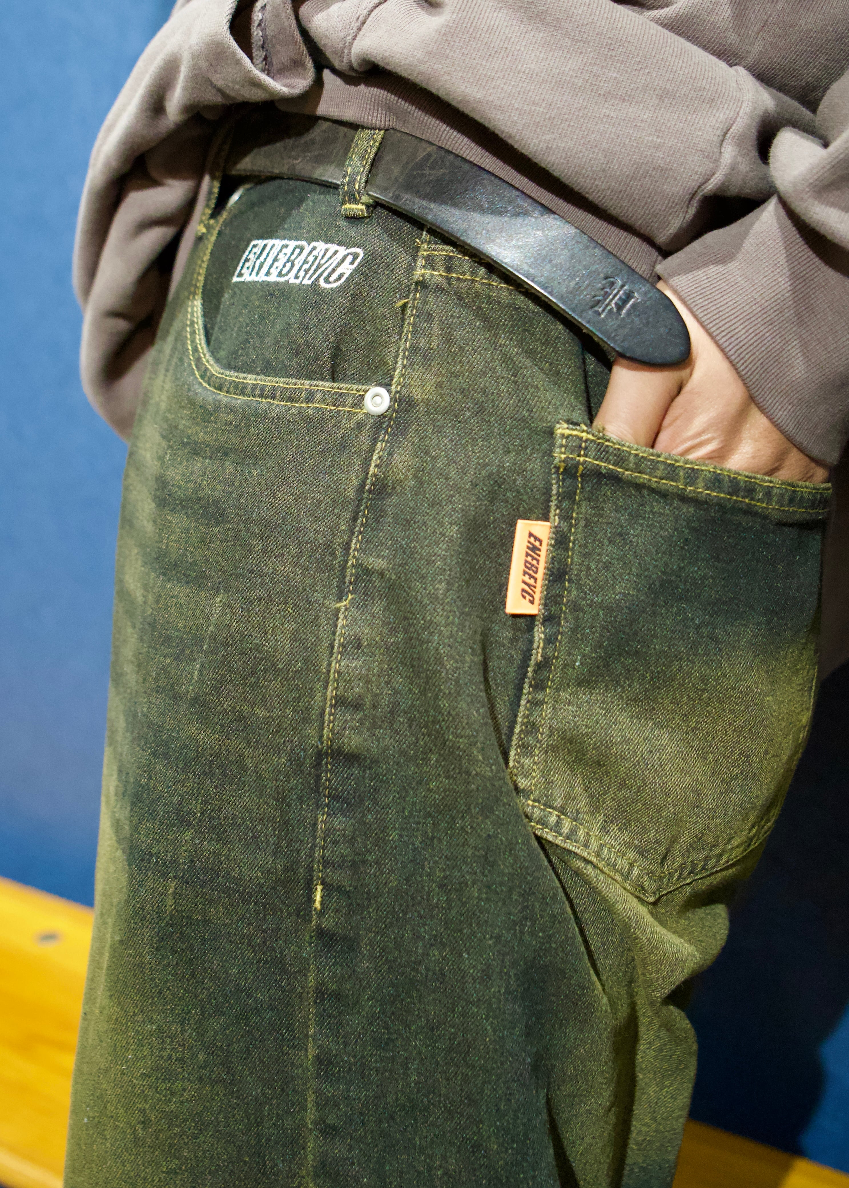 左ポケット上 : 中抜きブロックロゴ刺繍