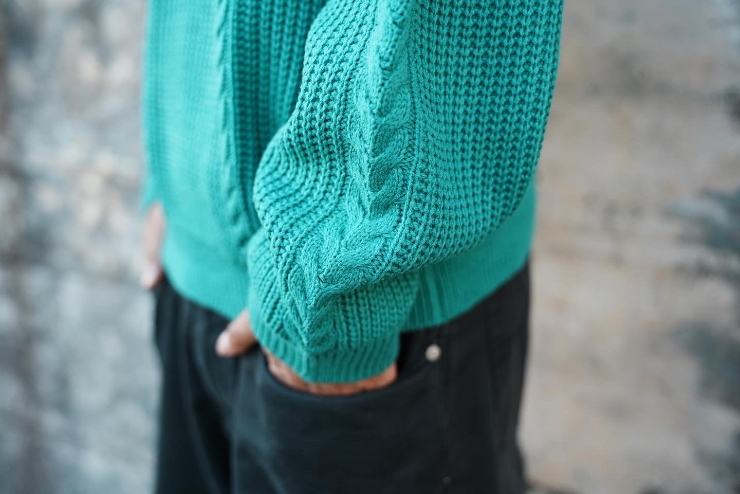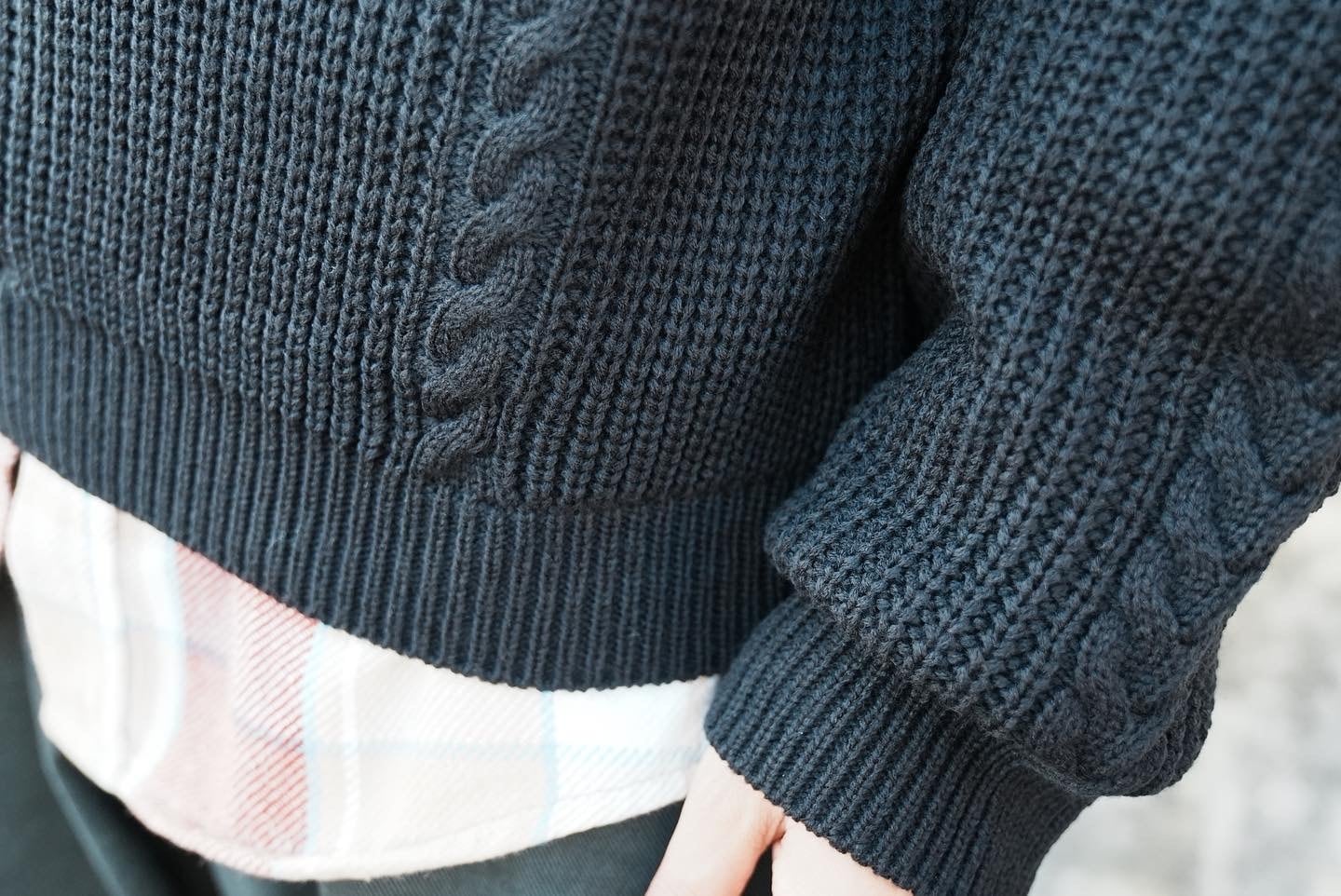 シンプルなLOGOデザインが、ケーブルニットを引き立てます。多すぎず少なすぎないケーブルの配置が抜群な一枚です!